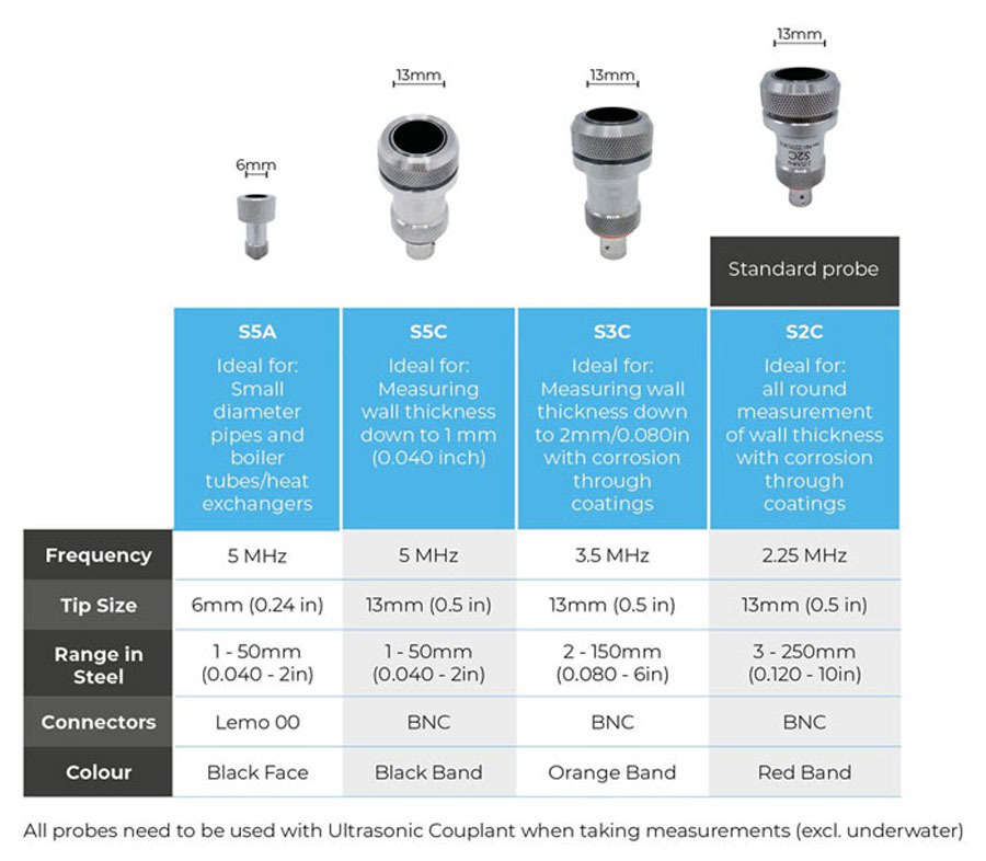 To compliment the Cygnus ultrasonic thickness gauges, Cygnus offers a range of ultrasonic transducers. The performance of any ultrasonic thickness gauge relies heavily on the transducer and its suitability to the material being measured. Therefore, selecting the right transducer is vital. All Cygnus’ transducers are made from stainless steel and have a hard wear face or a wear membrane to protect the transducer.