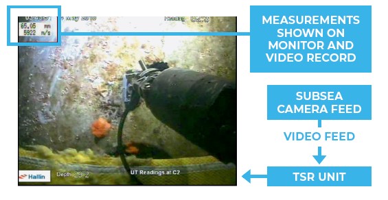 ![]() ![]() ![]() ![]() Topside Repeater with Video OverlayThe Topside Repeater can also overlay the real-time thickness measurements on to a composite video signal, superimposing it on the survey camera’s monitor screen. It will also then be recorded if there is a video of the survey, showing exact locations and their thickness measurement for future reference.