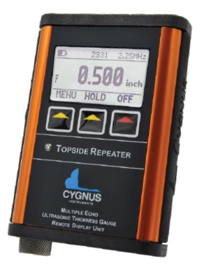 ![]() ![]() TOPSIDE REPEATER (TSR) REMOTE DISPLAY UNITThe Cygnus Topside Repeater is a remote display unit available as an option for the subsea range. It displays the thickness measurements at the surface in real-time during the survey.